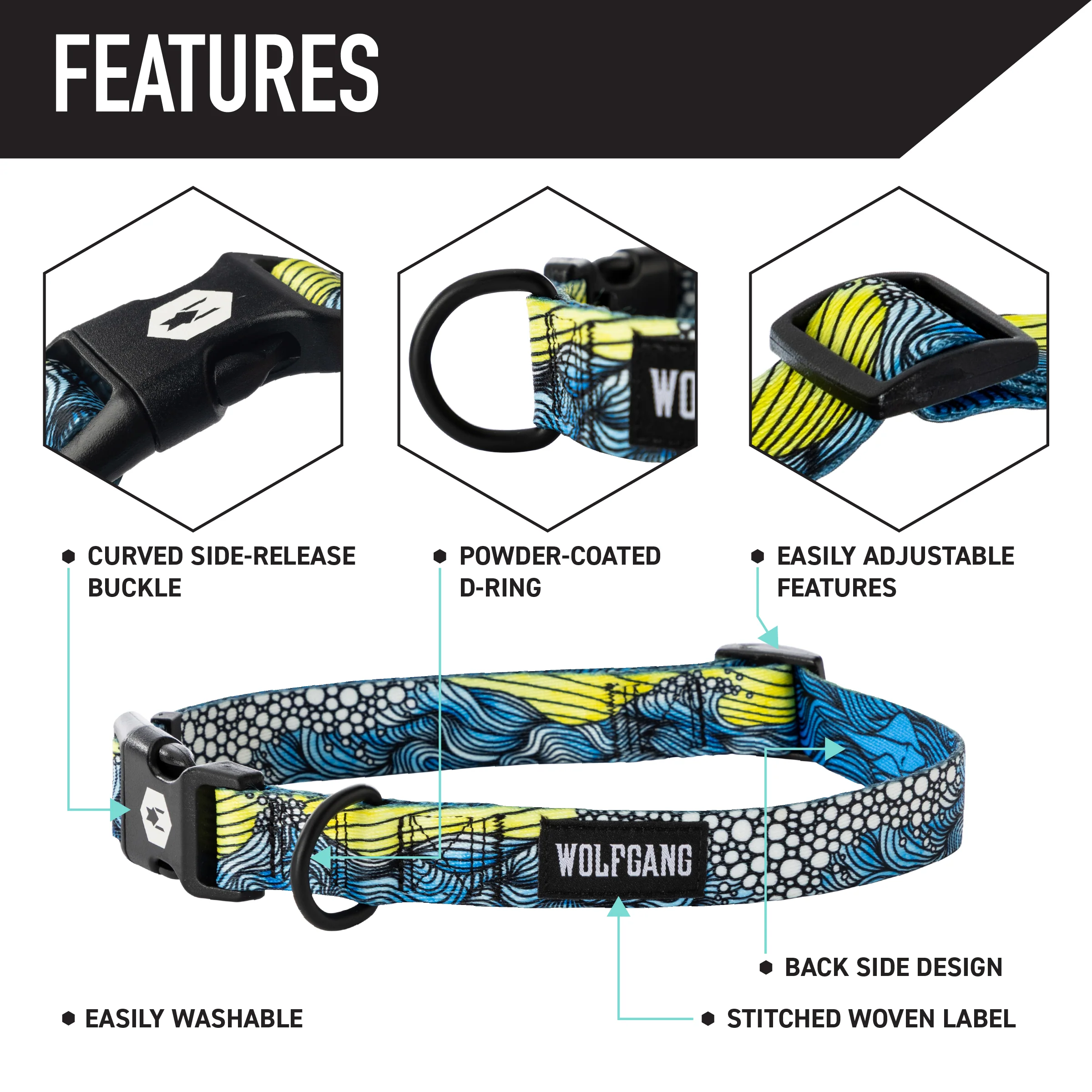 Wolfgang dog accessories are made with premium craftsmanship, designed to stand up to daily use and the toughest conditions while maintaining functionality. Made with Highly durable, abrasion-resistant polyester webbing to resist wear and tear, while the adjustable fit ensures a secure and comfortable experience for your pup.